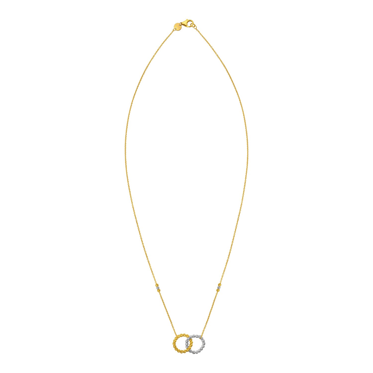 Elevate your elegance with this 14K two-tone gold necklace, featuring interlocking circles that symbolize unity and harmony. The contrasting hues of yellow and white gold create a captivating visual appeal, making it a versatile accessory suitable for any occasion. Measuring 18 inches in length, it rests gracefully on the neckline and is secured with a reliable lobster clasp. Expertly crafted for lasting beauty, this necklace is a timeless addition to your jewelry collection.
