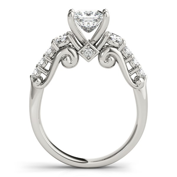 Radiating antique-inspired elegance this 3 stone ring showcases a princess cut headstone with two surrounding round diamonds adorned with band stones and flourishes, this beauty made of 14k white gold.