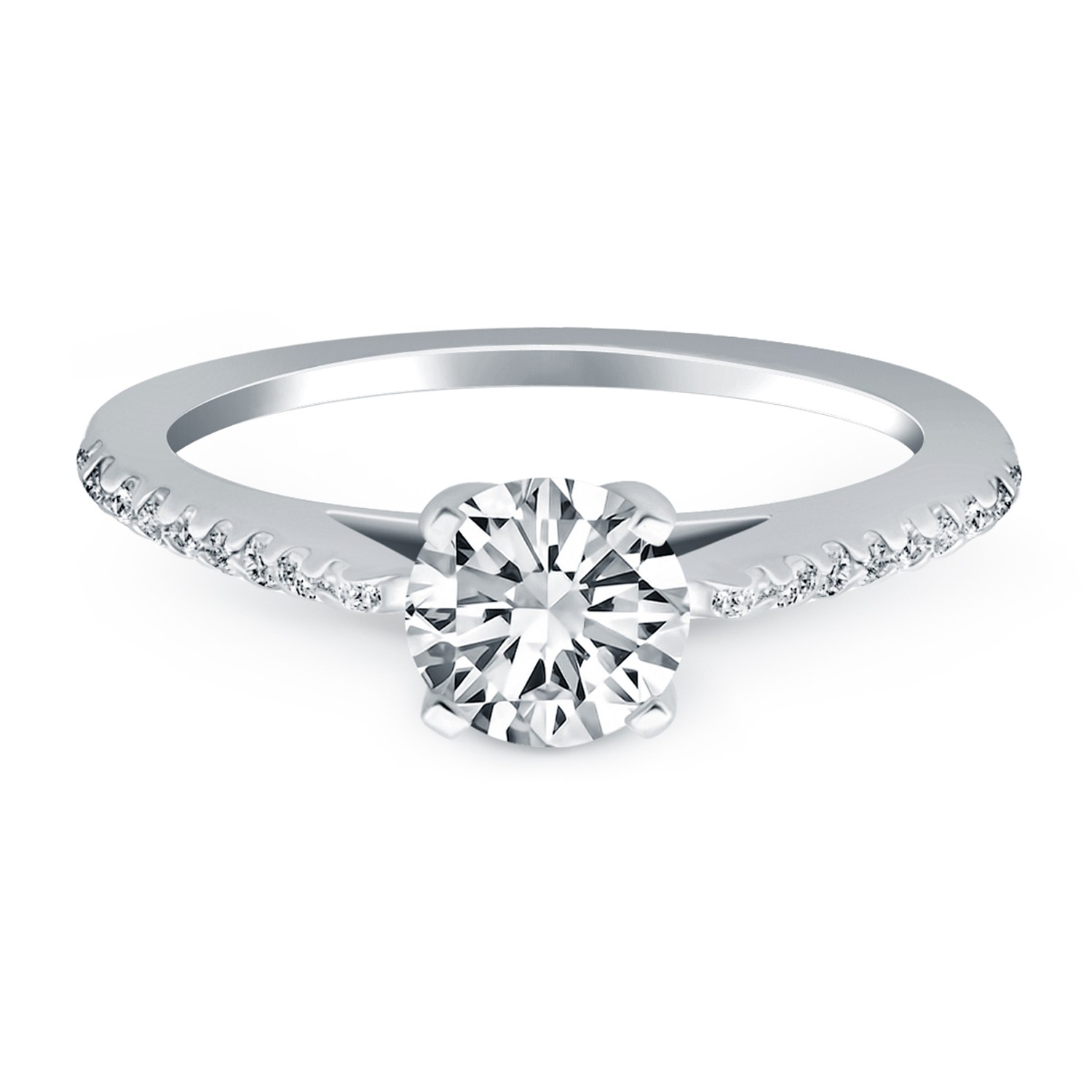 A glittering row of micro prong set diamonds enlivens the slender band of this beautiful streamlined cathedral engagement ring. Expertly crafted in 14k white gold, the center highlights a sparkling 1/2 carat round cut diamond.