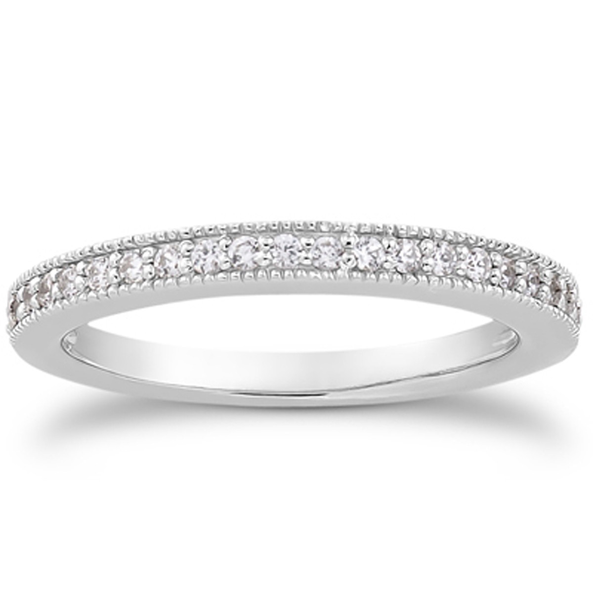 Meticulously set with intricate details, this beautifully crafted ring features a row of pave diamonds bordered by delicate milgrain edges. The milgrain texture brings vintage appeal to the classic diamond ring design. Expertly crafted in 14k white gold, this band embodies romantic elegance to last a lifetime.