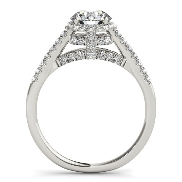 This polished 14k white gold engagement ring showcases a classic round cut center stone with exquisite pave set diamonds along the halo and shank.
