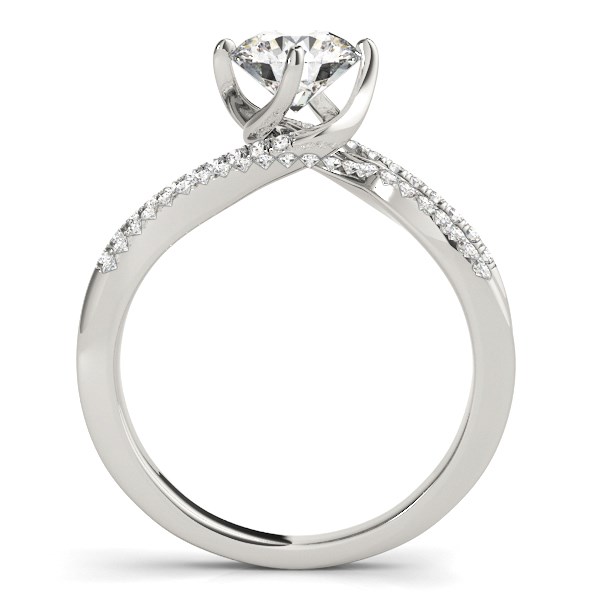 The elegantly pronged round cut center stone is highlighted by the exquisite spiral motif double row pave set shank of this diamond engagement ring. Wonderfully crafted in 14k polished white gold.
