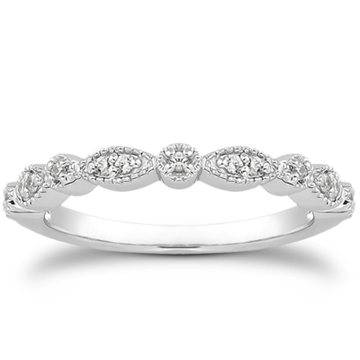 The sculptural appeal of this vintage-inspired diamond wedding ring features round, and marquis shapes set with glittering pave diamonds and bordered with milgrain edges. Elegant and sophisticated, this ring exudes antique charm. The 14k white gold imparts a lustrous sheen.