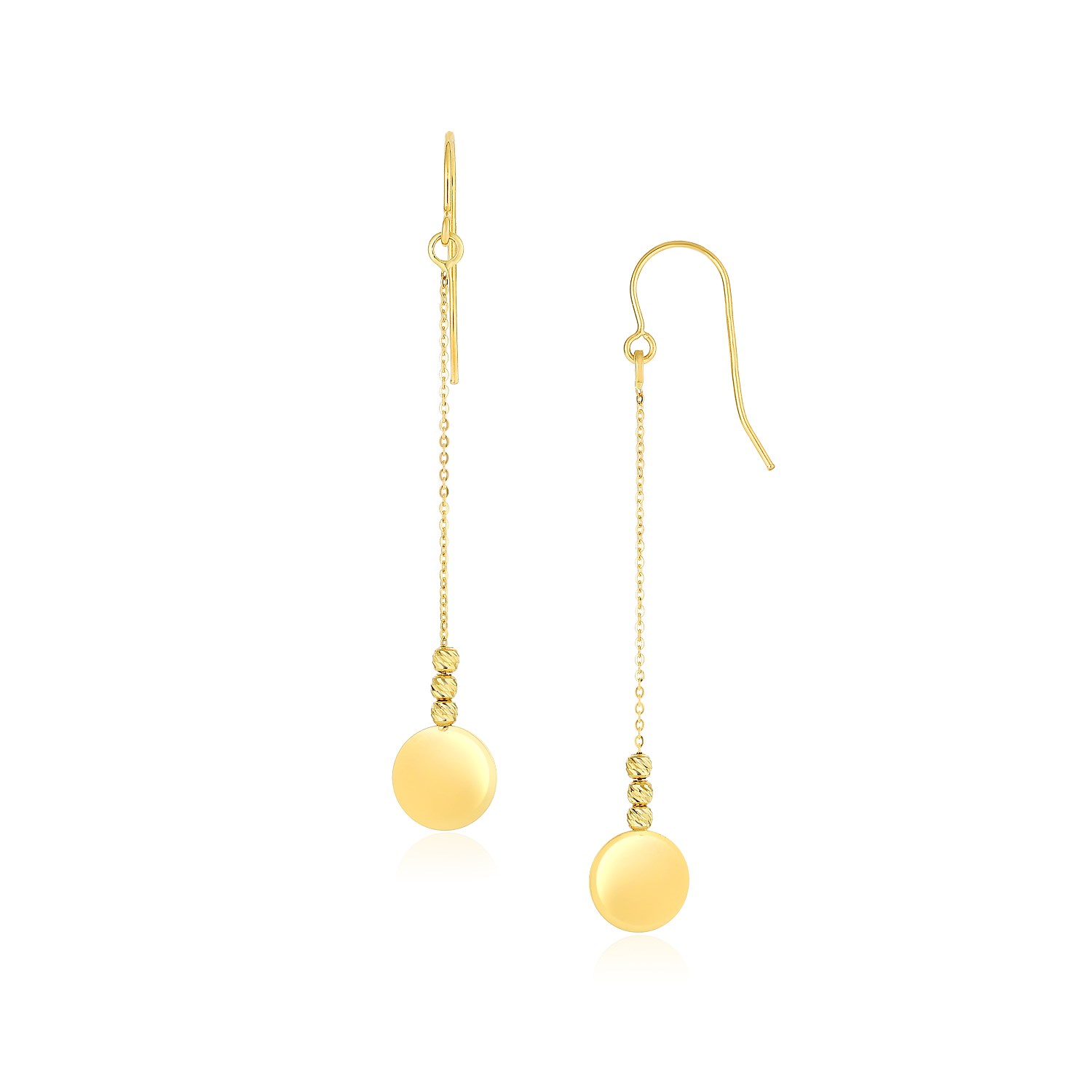 A darling pair of dangling chain earrings with diamond cut beads and flat shiny discs. Made of 14k yellow gold and secured with french wires.