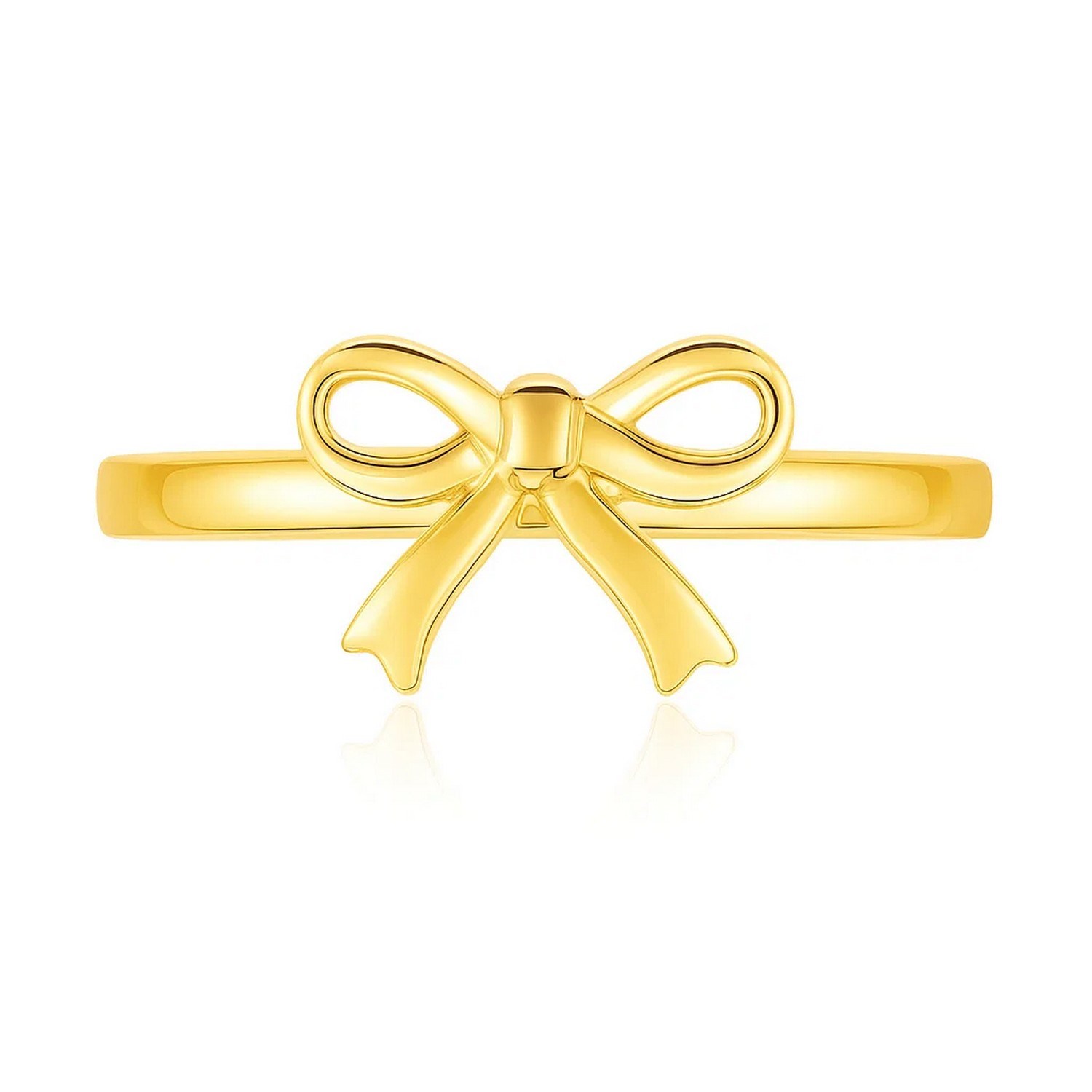 Demure and feminine, our 14k yellow gold bow ring is a stylish and lovely expression. Expertly crafted, the features include a bright polish and a ring band with lapped edges