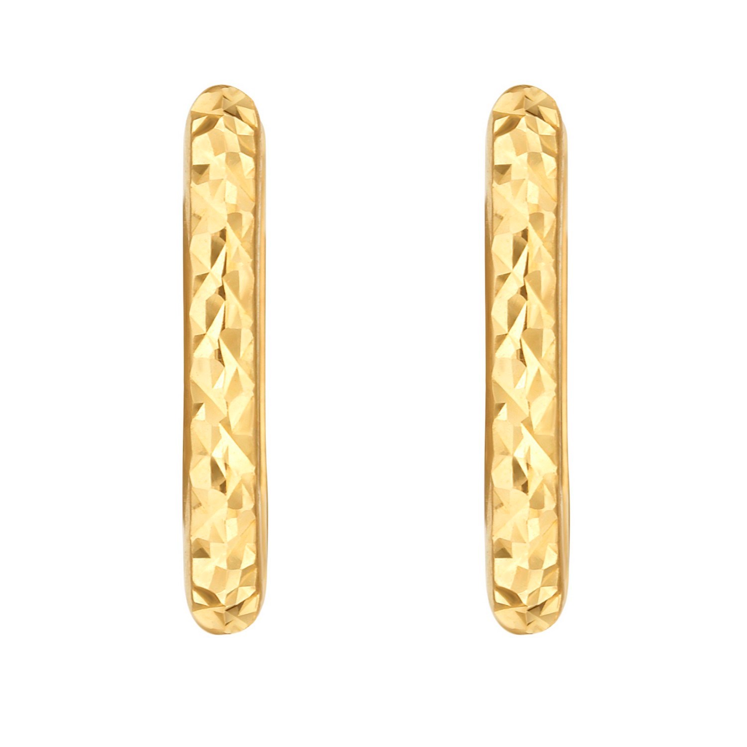 Elegant 14K yellow gold diamond-cut fancy huggie earrings featuring a radiant polished finish and intricate faceted detailing. The diamond-cut texture enhances light reflection for added sparkle, creating a timeless, sophisticated look perfect for everyday wear or special occasions.