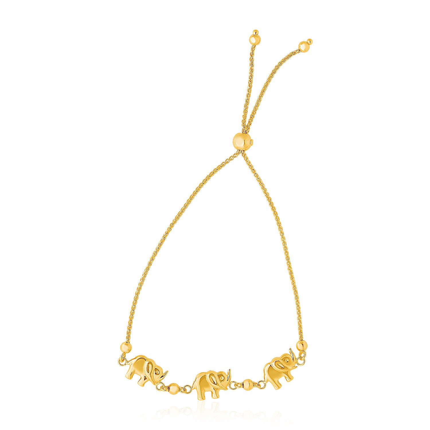 This darling chain bracelet features three elephants and bead detailing. Made of 14k yellow tone gold, this showcases a lariat style drawstring closure.