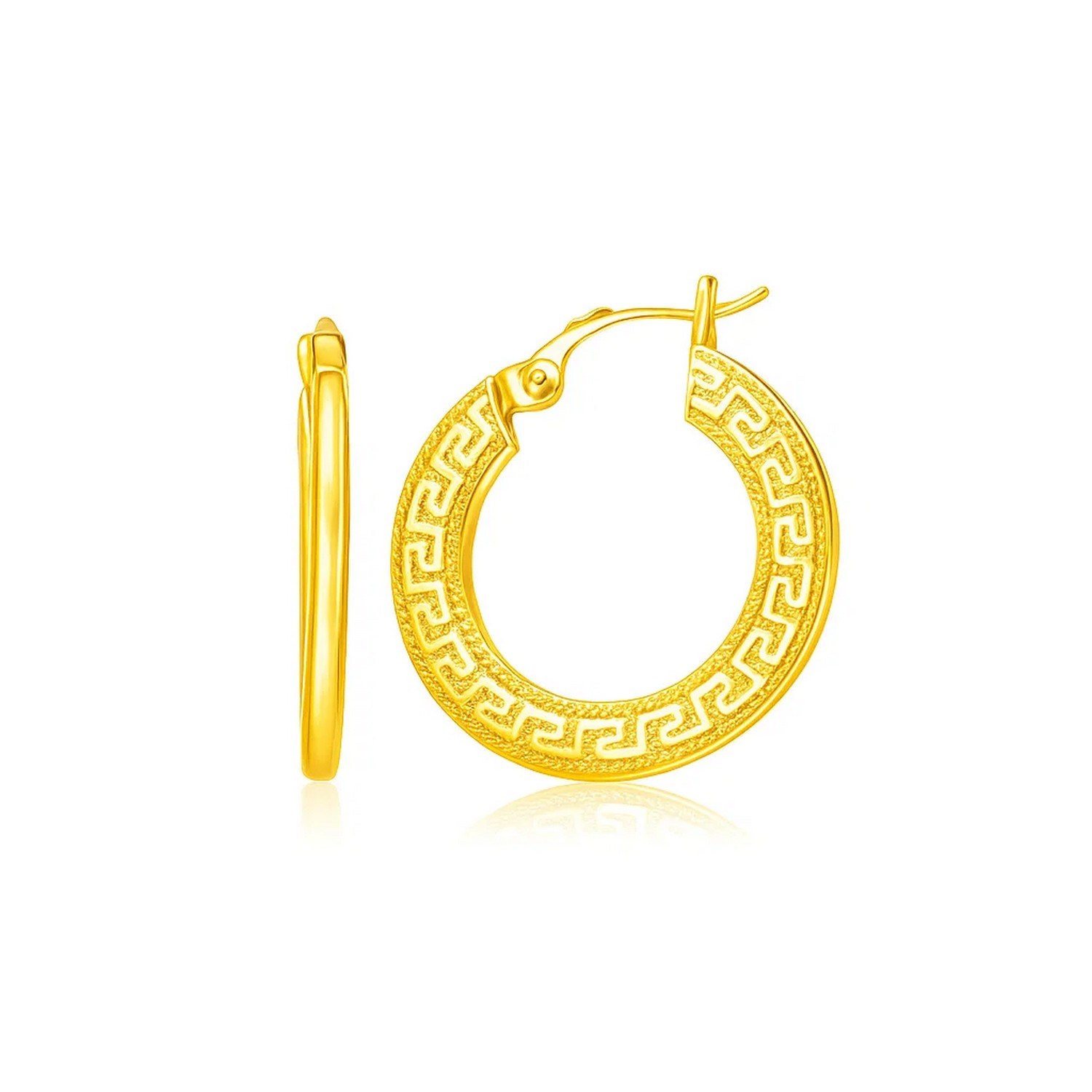 These beautifully patterned earrings feature a slim profile combined with a wide silhouette that proves to be an ample canvas for an attractive and classic design. Expertly crafted in 14k yellow gold, these medium Greek key hoop earrings feature snap-lock closures to keep them secure.
