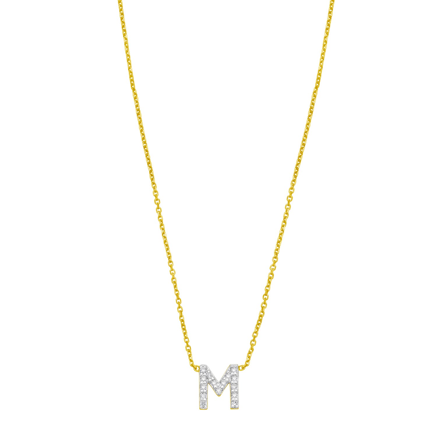 Celebrate individuality with this 14K yellow gold mini diamond M initial pendant. Adorned with sparkling round diamonds, this dainty yet elegant piece adds a personal touch to any look. Perfect for everyday wear or as a thoughtful gift, it comes with an 18 inches chain and a secure spring ring clasp for lasting beauty and comfort.