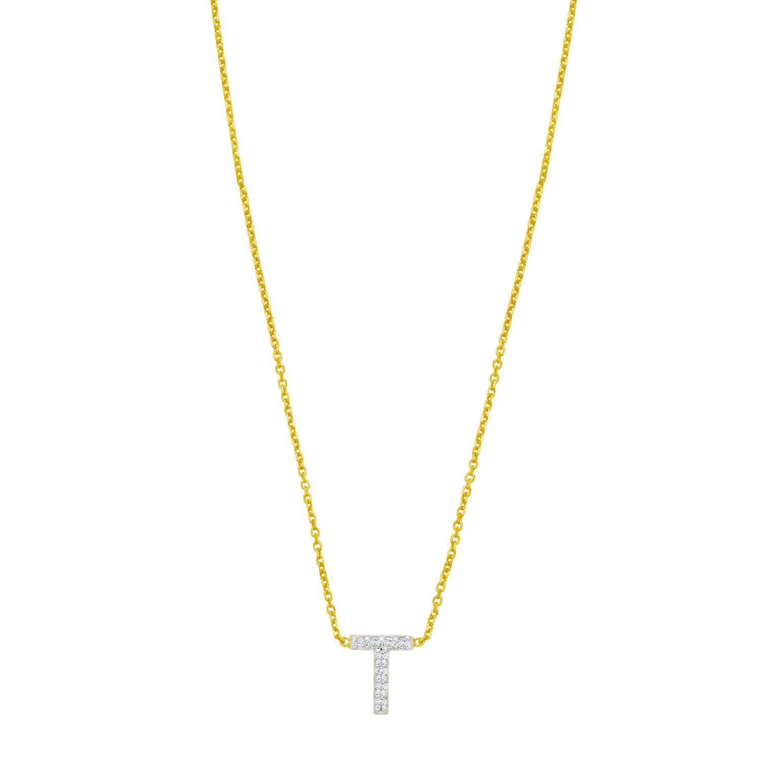 Celebrate individuality with this 14K yellow gold mini diamond T initial pendant. Adorned with sparkling round diamonds, this dainty yet elegant piece adds a personal touch to any look. Perfect for everyday wear or as a thoughtful gift, it comes with an 18 inches chain and a secure spring ring clasp for lasting beauty and comfort.
