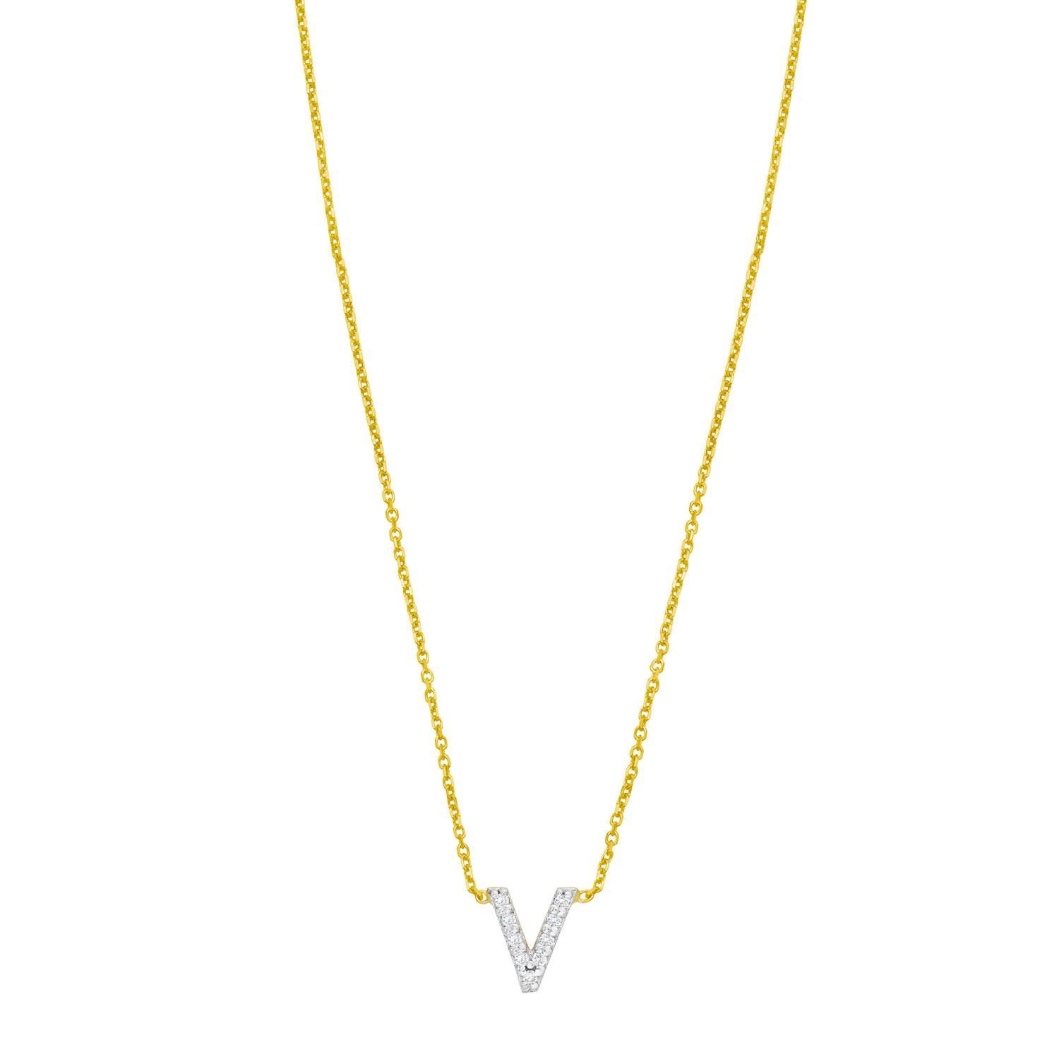 Celebrate individuality with this 14K yellow gold mini diamond V initial pendant. Adorned with sparkling round diamonds, this dainty yet elegant piece adds a personal touch to any look. Perfect for everyday wear or as a thoughtful gift, it comes with an 18 inches chain and a secure spring ring clasp for lasting beauty and comfort.