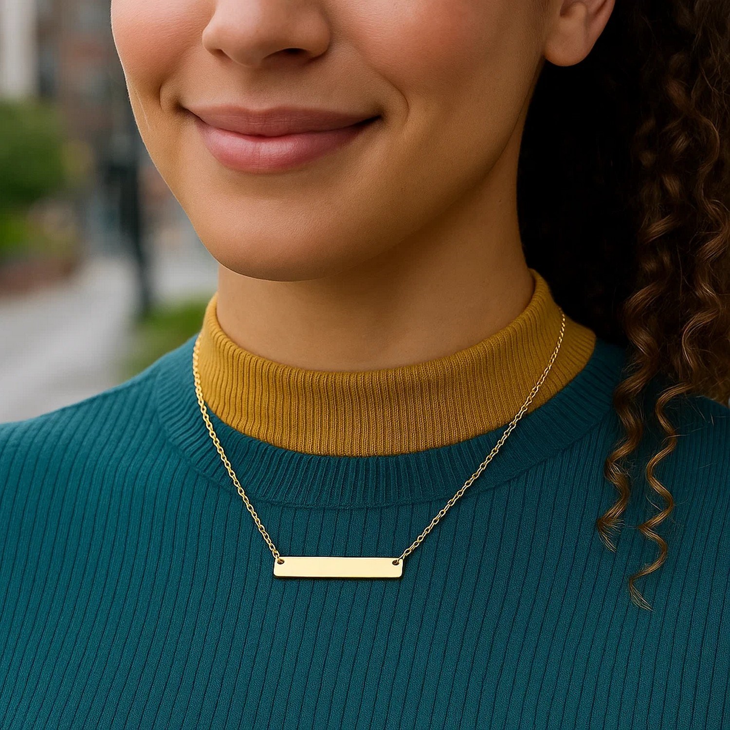 This delightfully unique necklace features a slim and flat horizontal bar connected to a delicate chain. Made of 14k yellow gold, this measures 18 inches and is secured with a spring ring clasp.