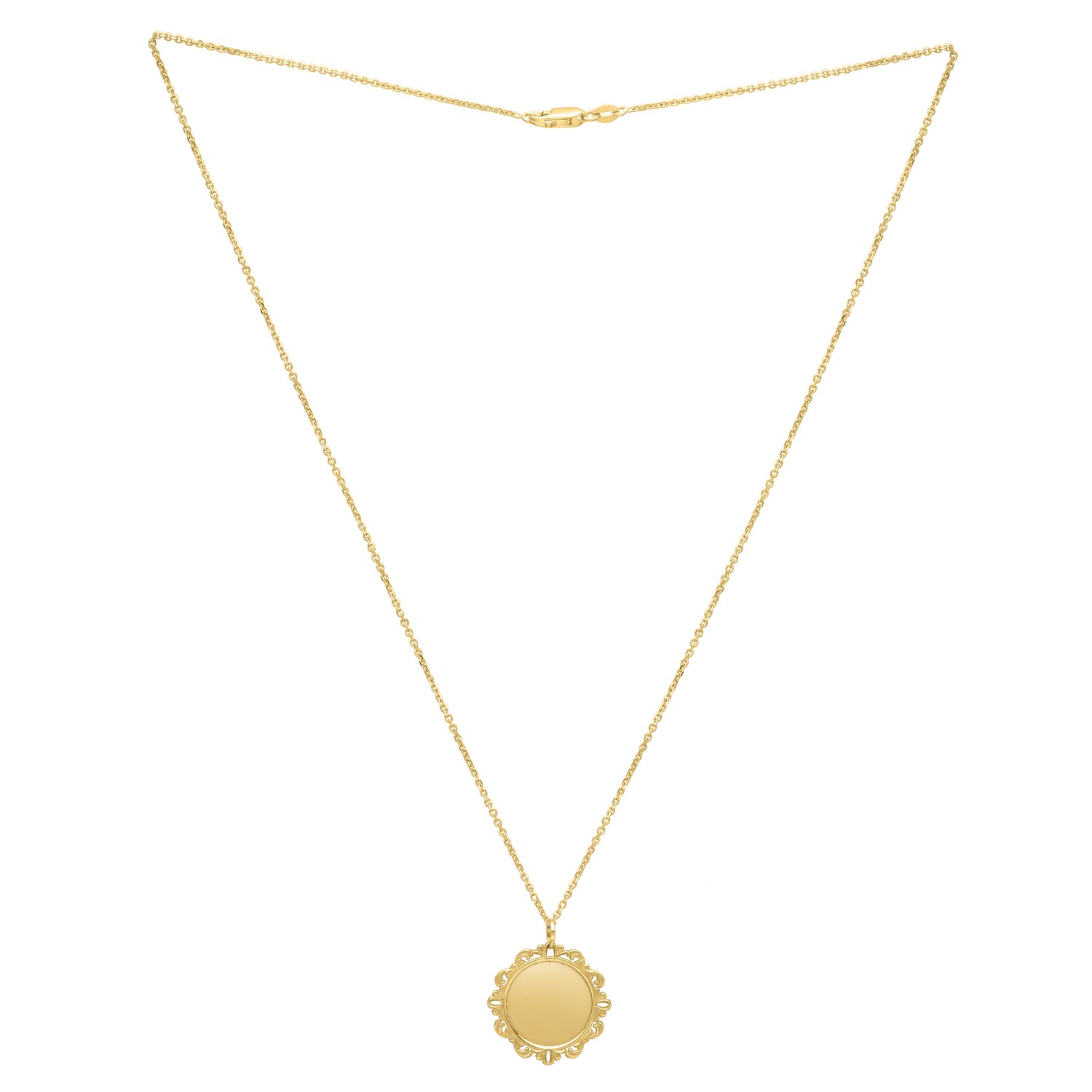 With intricate lace-like detailing, this 14k yellow gold baroque round pendant transforms the classic circle into a captivating work of art. The polished yellow gold finish enhances its delicate design, while the 18 inches chain provides the perfect complement. A timeless piece for those who appreciate fine detail and artistic elegance. Secured with a lobster clasp closure.