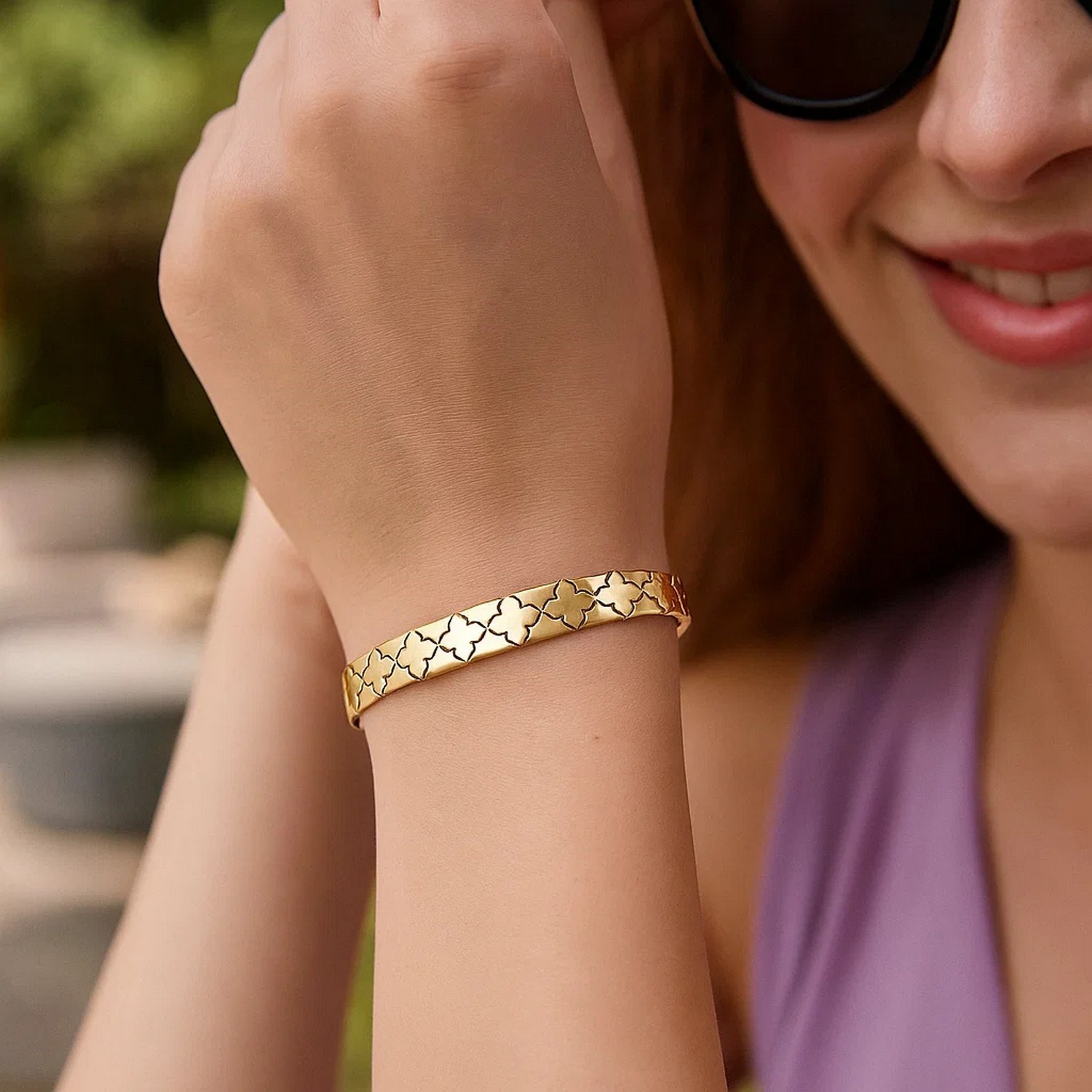 Capture the essence of nature with this exquisite 14k yellow gold bracelet. Measuring 7 inches, its organically inspired motif evokes the natural beauty of flora, accented by delicate hints reminiscent of a four-leaf clover gracefully gracing your wrist. The polished finish enhances its feminine allure, while its generous width commands attention, making it a captivating symbol of natural elegance.
